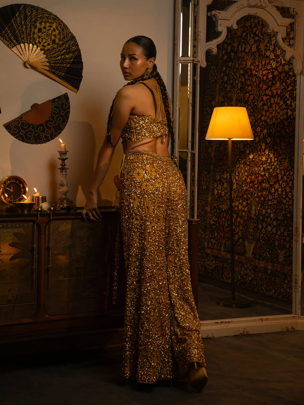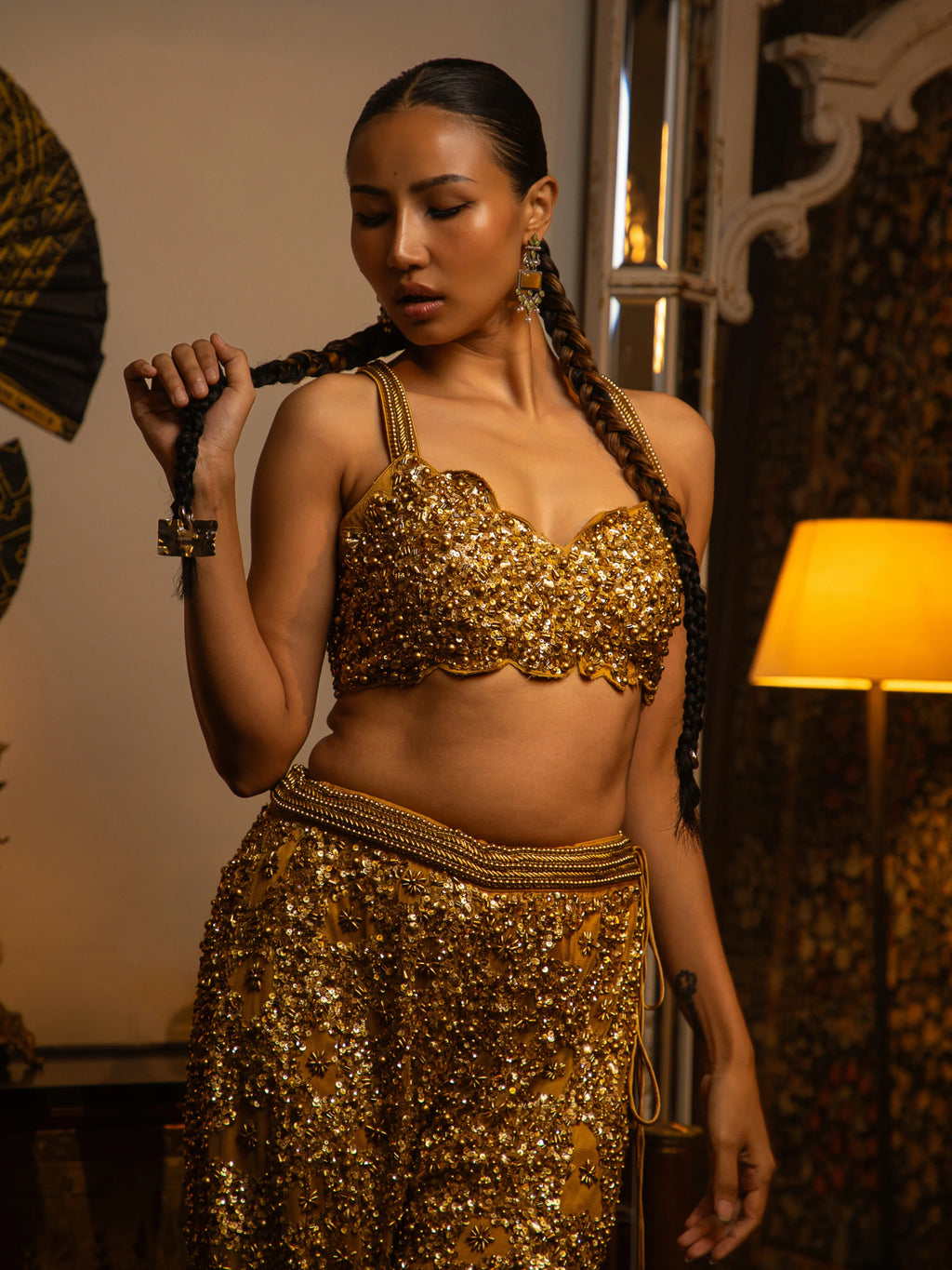 A gold net sharara with sequin work, paired with a matching spaghetti-strap blouse.